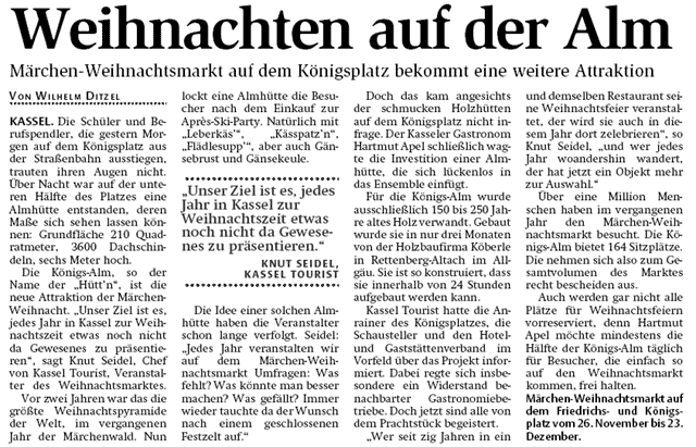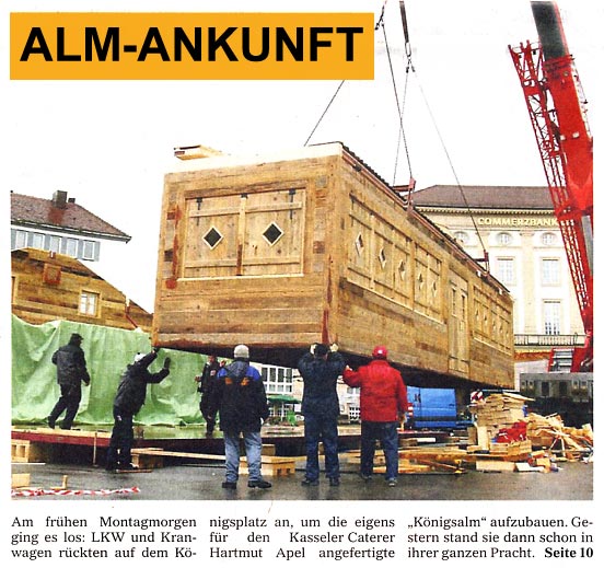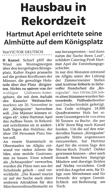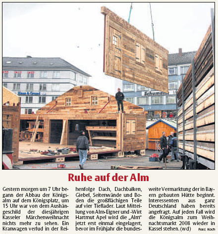 Drei Wochen Pause Den Zeitplan für den Neubau erklärte Apel folgendermaßen: Am 12. Oktober macht die Königsalm Betriebsferien und wird abgebaut. Der Abbau der mobilen Alm dauere nur einen Tag. In den folgenden drei Wochen wird dann die neue Alm aufgebaut. Die Wiedereröffnung ist für den 6. November geplant. Der beliebte Treffpunkt werde bereits zur Eröffnung am 23. November wieder auf dem Kasseler Weihnachtsmarkt stehen. „Durch diese Entscheidung gehen jetzt viele Spekulationen über die Zukunft der Königsalm zu Ende“, sagte Bürgermeister Paul. „Die Frage, wo die Königsalm in Zukunft stehen wird, musste ich in letzter Zeit 150 Mal am Tag beantworten“, sagte Apel.