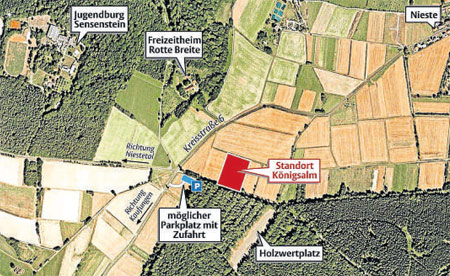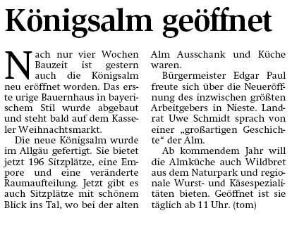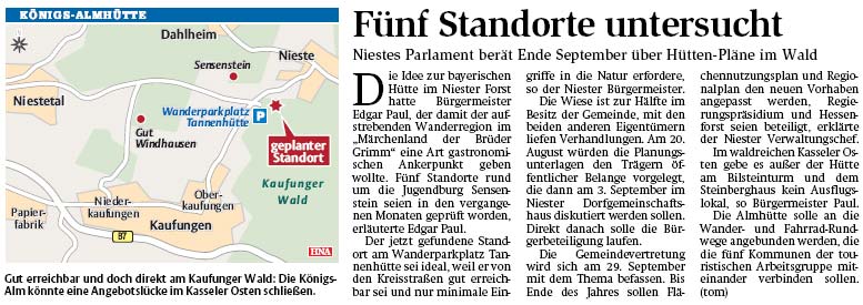 mobile Almhütte auf die Höhe zwischen Nieste und Kaufungen zu stellen. Die Attraktivität der Wanderregion Nieste könne damit noch weiter gesteigert werden - außerdem biete der Standort in der Nähe der Straße eine breite Palette von unterschiedlichen Nutzungsmöglichkeiten, erklärte Schlitzberger. „Die Königsalm rundet die bisherigen touristischen Initiativen der Gemeinde ab und ist auch eine gute Ergänzung zum Angebot der Jugendburg und Sportbildungsstätte Sensenstein“, sagte der Landrat.