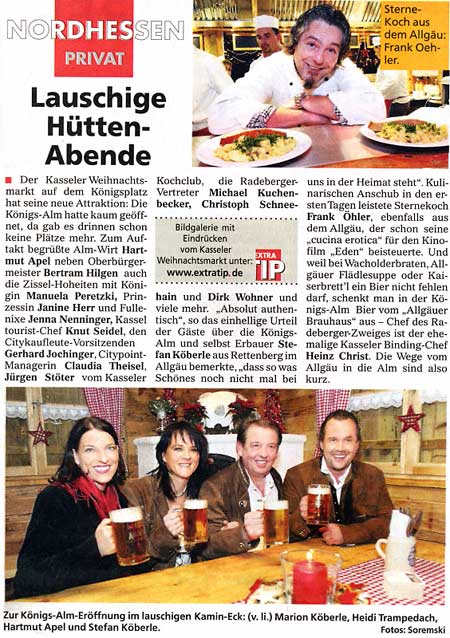 Thomas Stier Die Almhütte ist mobil: Bis Ende November bleibt das urige Holzhaus am Kaufunger Wald stehen, dann wird es auf den Kasseler Königsplatz umgesetzt, wo es seit zwei Jahren zu den Attraktionen des Weihnachtsmarktes zählt. Die Küche wird an beiden Standorten bodenständig und deftig sein. Es gibt bayerische Schmankerln, Biere und Spezialitäten. Künftig werden aber auch Wild, Fisch und Pilzgerichte mit Zutaten aus dem Naturpark serviert werden, auch Schaf und Lamm aus den Herden heimischer Schäfer sollen die Speisekarte bereichern. „Wir wollen eine einfach, aber gute bayerische und regionale Küche anbieten“, formulierte Investor Hartmut Apel seinen Anspruch an die Königsalm. (tom) |