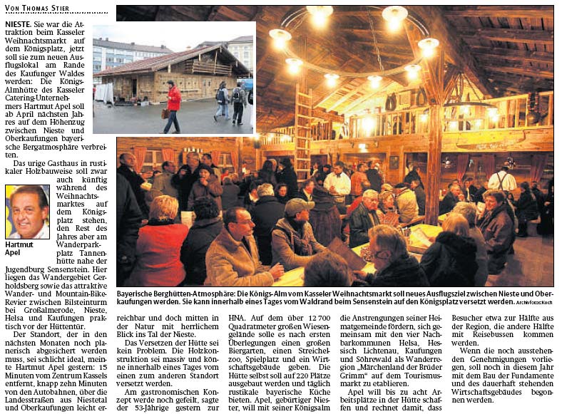 Nieste. Langwierige Überlegungen und Diskussionen sind nicht Hartmut Apels Sache. Von der Idee bis zur Eröffnung der Königsalm im Kaufunger Wald bei Nieste verging nicht einmal ein Jahr. Und jetzt hat der Catering-Betreiber aus Kassel erneut Nägel mit Köpfen gemacht: Im Herbst wird die mobile Königsalm abgebaut, damit sie pünktlich zur Eröffnung des Weihnachtsmarktes wieder in Kassel ist.
